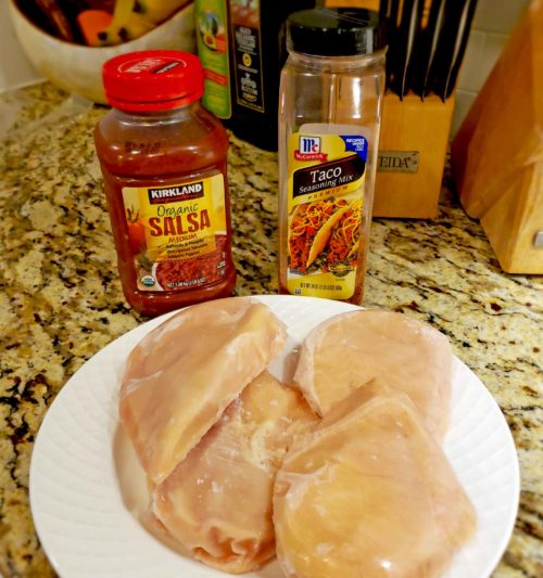1. Place the frozen chicken breasts in the cooker, add taco seasoning, top with salsa and water. Move chicken around to coat and prevent burning at the bottom.