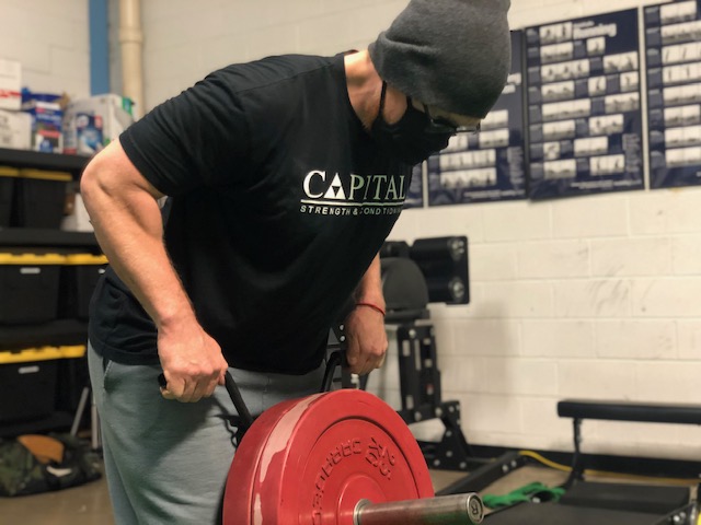 Open your chest, pull your shoulders down and back, and take a breath in to brace. Keep your back neutral throughout the movement.