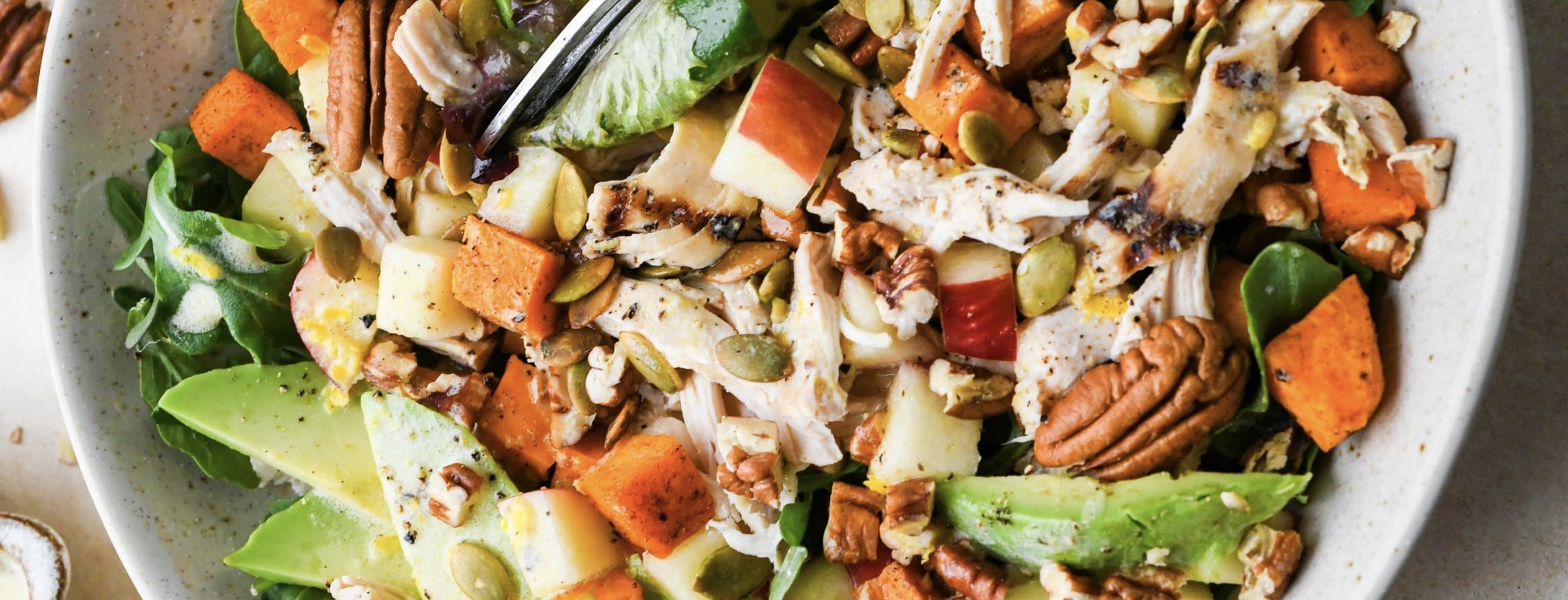 Crisp greens topped with juicy herb-roasted chicken, caramelized winter vegetables, and a tangy mustard vinaigrette—comforting yet light.